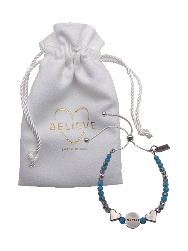 Elevate your style and motivation with our Turquoise & Blue "Inspire" Beaded Bracelet. Featuring a vibrant mix of turquoise and blue beads, this bracelet is a striking accessory designed to uplift and inspire. The centerpiece is a charming bead engraved with the word "Inspire," flanked by two delicate silver heart beads that add a touch of elegance. The silver adjustable closure ensures a perfect fit for any wrist, making this bracelet a meaningful and stylish reminder to embrace your inner strength and chase your dreams.