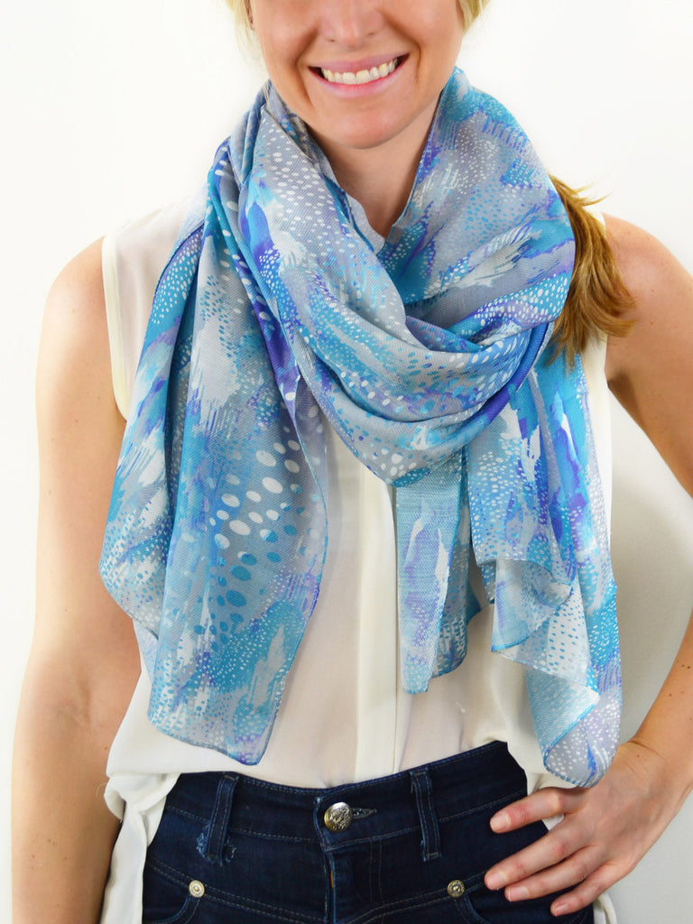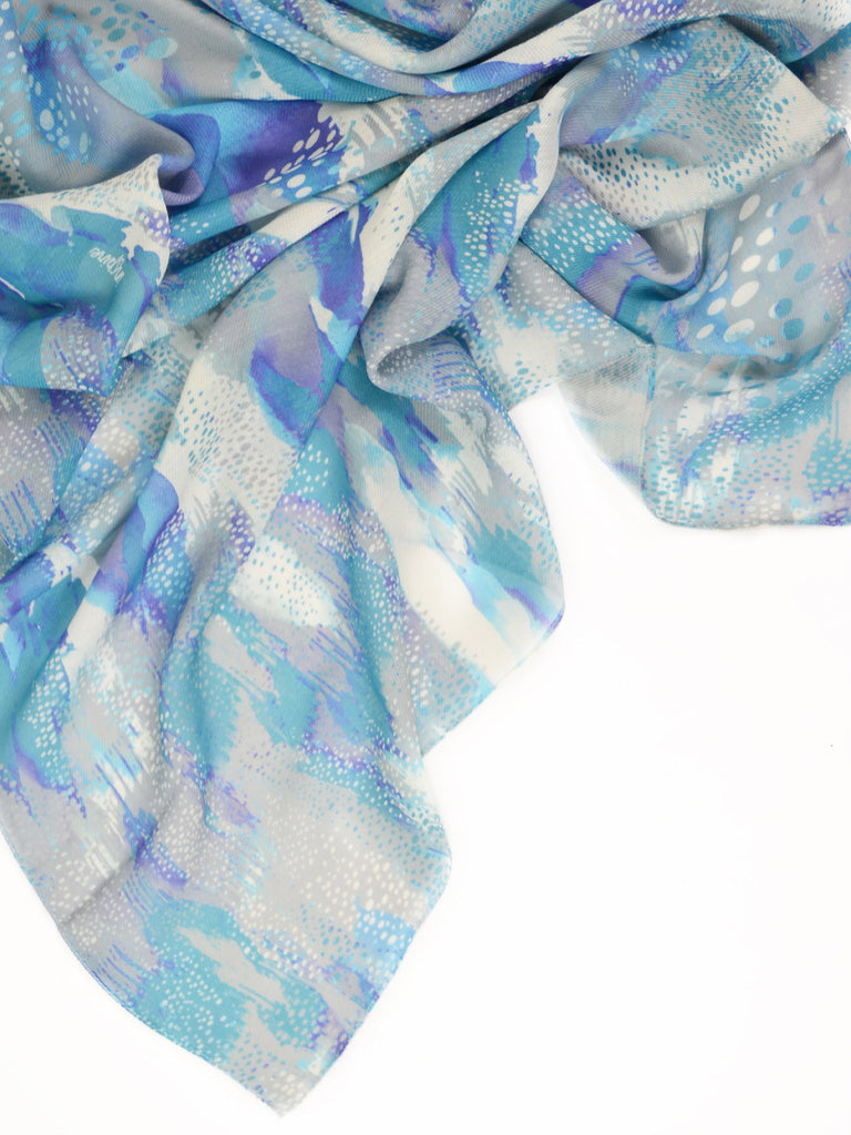 This watercolor print scarf was developed by different watercolor pieces layered with geometric elements. This scarf is in our new silk wool which is an incredibly luxurious fabric that is very soft and feels amazing against your skin. Pair this with every piece of denim in your closet immediately.